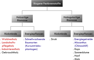 Das Schaubild zeigt die derzeit genutzten Brennstoffe (rot) und die zukünftig angebauten Pflanzen zur Biomassebereitstellung (blau).